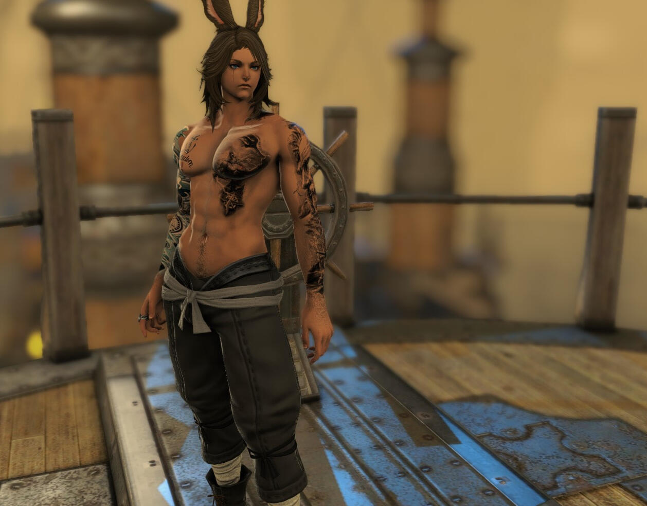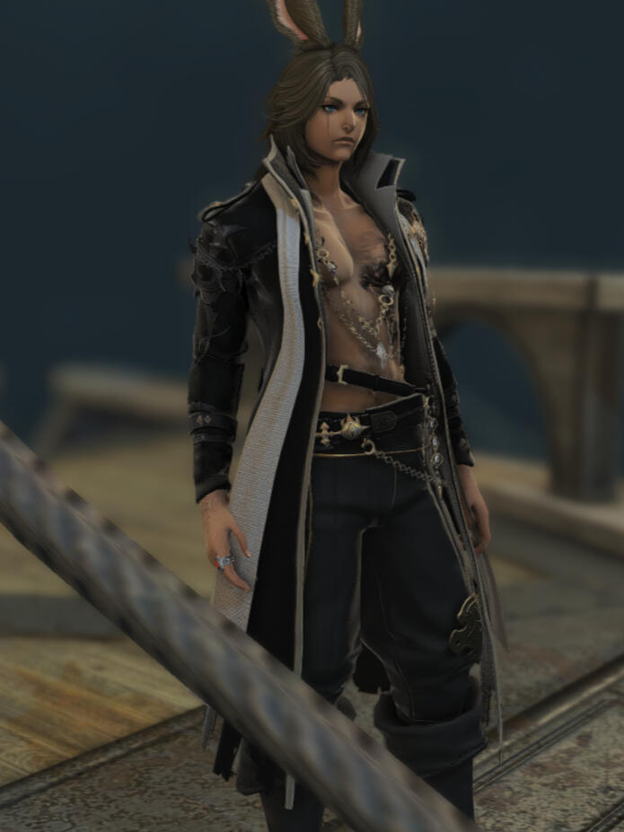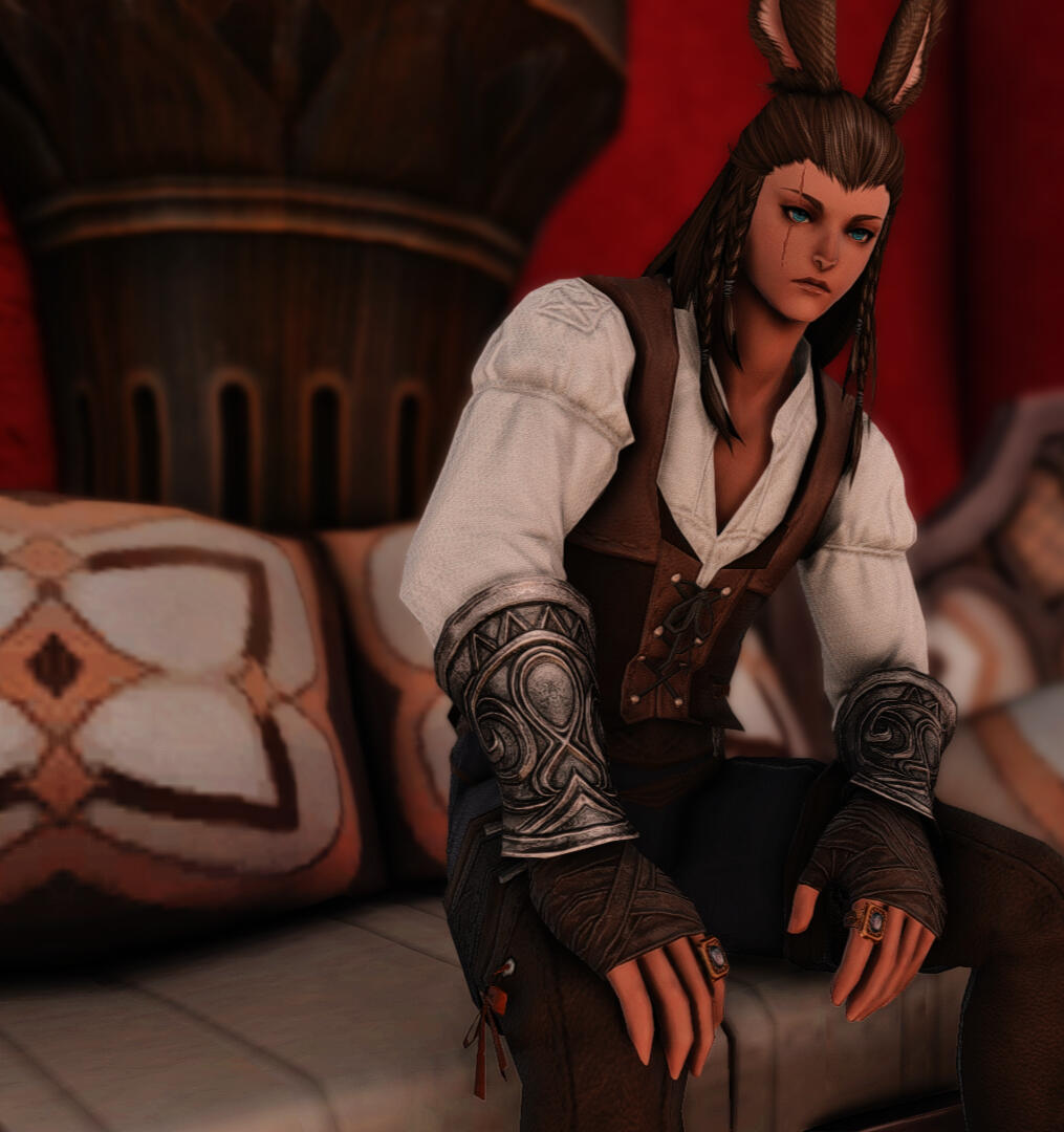 BackgroundA Viera born in the Golmore Jungle, Turas found himself alone by his fourteenth nameday after his hunting party was reportedly killed in an encounter with an unusually large pack of hellhounds while unprepared. Alone and wandering for days, Turas found himself lost along the shores of Golmore, north of Valnain. There he found a ship anchored off coast where the crew repaired a mast. Desperate and hungry, Turas swam to the ship and climbed aboard, doing his best to sneak past the occupied crew. After finding scraps of food, he hid himself among the cargo where he fell fast asleep. He was found by the crew within a day. The ship already at sail, he was forced into manual labor to earn his passage. He could not have guessed where he was or where the ship was going, but something inside of him was suddenly at ease with this fate.The weeks turned to months, then years. He labored as a cabin boy after a time, and later a rigger. By his twenties he was an able-bodied sailor. Home was a fading memory. The ship’s headquarters was in La Noscea where Turas grew to be observant, intelligent, and adept at various jobs on the ship gaining the favor of the senior officers. At only twenty years his mounting success brought him much pride, but, in his naivety, he was unaware of those resentful of his promising skills. One evening just days before a rumored promotion to boatswain, Turas was met by an assassin as he slept. Whether luck or fate, a commotion awoke Turas just as the assassin prepared his killing blow. Barely escaping with his life and uncertain who sent the assassin, Turas could not return to the crew. While in hiding, Turas sought the shelter of the Rogue’s Guild for their teachings as much as their protection.While still early in his training, Turas was sloppy and drew the attention of the Crimson Fleet and Maelstrom Command. The Maelstrom spent little time in active pursuit of Turas but they were forceful enough to keep Turas moving. He traveled to the northeast away from familiar faces and lands, spending the next few years testing his skills on the gullible and ignorant.The next thirteen years, Turas adventured throughout Eorzea, an independent rogue executing whatever contract came his way. He mastered his skill yet still felt drawn to his privateering lifestyle. He returned to La Noscea and met a group of smugglers recruiting a Gunner’s Mate for their next voyage. Turas promptly volunteered; however, the morning of the scheduled voyage the entire crew was captured and charged with trafficking. Only sentenced to four years for association, Turas was willing to accept his fate. He used his confinement to learn, watch, and think.After his release from gaol, he traveled to Ul'dah to recuperate. He now wanders Eorzea a scoundrel for hire. Smuggling is his main income though he is not opposed to any work that might be offered.